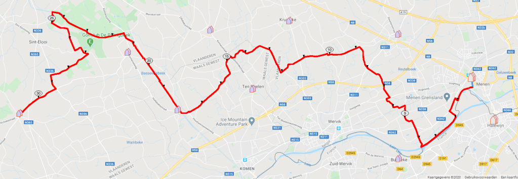 De route begint in Menen, waar ik een week eerder was geëindigd. Omdat ik toen met de kinderen naar topogidsnormen maar een halve dagtocht heb gemaakt, én omdat er door wegenwerken in Wijtschate-centrum een paar bushaltes niet bediend worden, klok ik uiteindelijk af op iets minder dan 37 km, ofwel ongeveer 7 uur effectieve wandeltijd.