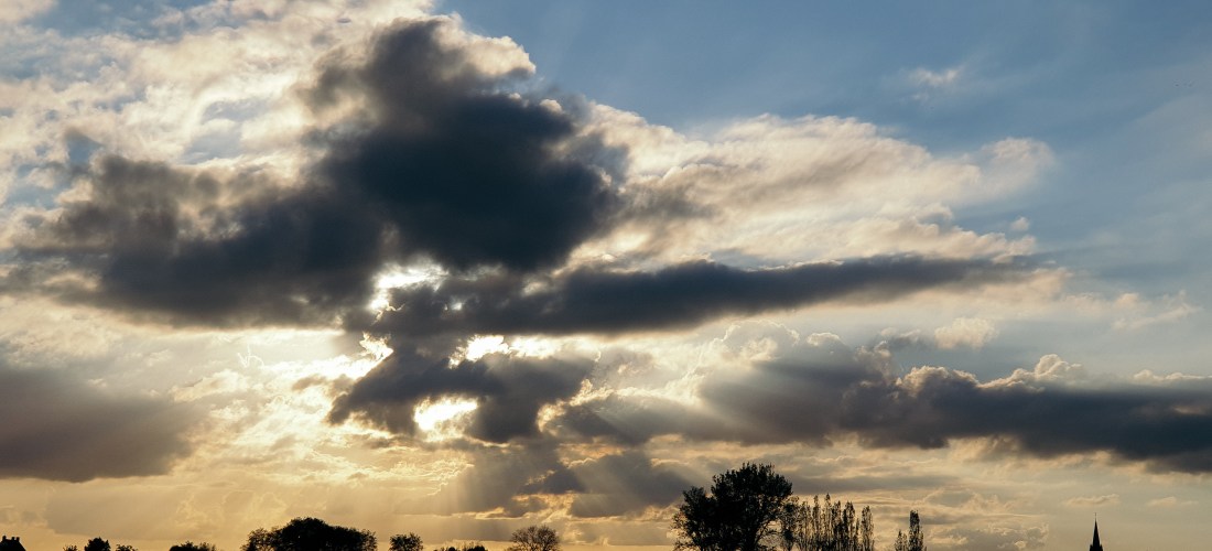 De constrasten worden steeds feller. De poelen in de gitzwarte akkers lichten vlammend op onder de schitterende jacobsladders. Aan de kim verschijnt de torenspits van de Onze-Lieve-Vrouw Onbevlekt Ontvangenkerk van het grensdorp Abele. Ik ben nog verre van halverwege.