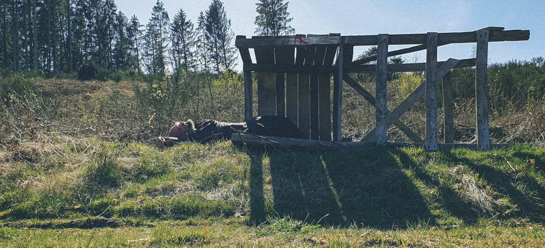 Opgezweept door de omgeving en ervaringen van jadis et naguère nachtraaf ik tussen de jachttorens, tot die me uiteindelijk tot de orde roepen, en ik zwicht. Onttroond laaf ik me aan de zon. In mijn nek prikken slingers bramen.
